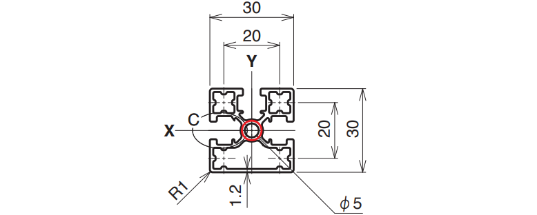| 6,000 mm | 15–4,000 mm | A6063S-T5 (205) | 225 N/mm² | 270.1 mm² | 0.729 kg/m | Ix 2.44 × 10⁴ mm⁴ Iy 2.52 × 10⁴ mm⁴ |