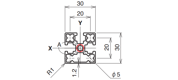 | 6,000 mm | 15–4,000 mm | A6063S-T5 (205) | 225 N/mm² | 308.2 mm² | 0.832 kg/m | Ix 2.57 × 10⁴ mm⁴ Iy 2.59 × 10⁴ mm⁴ |