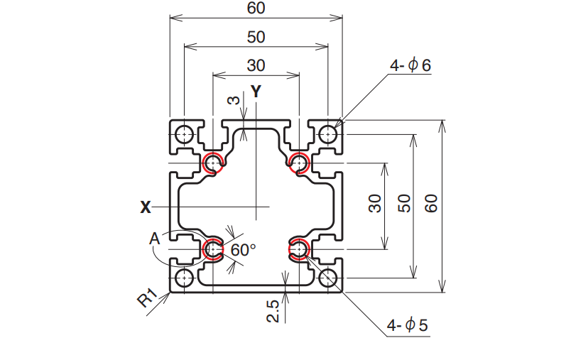| 6,000 mm | 15–4,000 mm | A6063S-T5 (205) | 225 N/mm² | 977.3 mm² | 2.639 kg/m | Ix 43.2 × 10⁴ mm⁴ Iy 44.2 × 10⁴ mm⁴ |