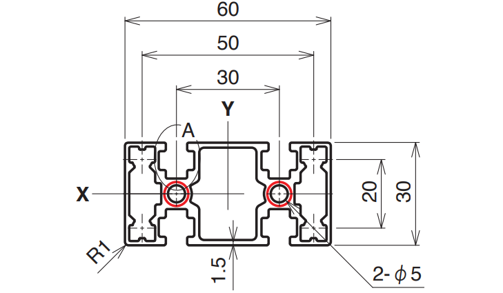 | 6,000 mm | 15–4,000 mm | A6063S-T5 (205) | 185 N/mm² | 518.7 mm² | 1.400 kg/m | Ix 4.74 × 10⁴ mm⁴ Iy 18.2 × 10⁴ mm⁴ |