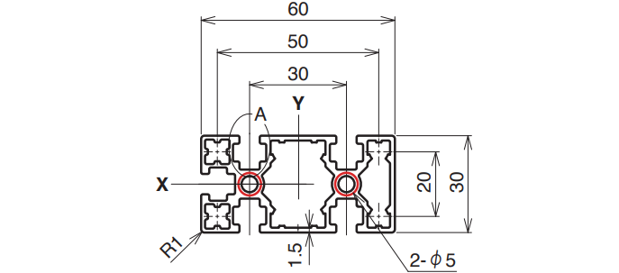 | 6,000 mm | 15–4,000 mm | A6063S-T5 (205) | 225 N/mm² | 533.6 mm² | 1.441 kg/m | Ix 4.97 × 10⁴ mm⁴ Iy 19.5 × 10⁴ mm⁴ |