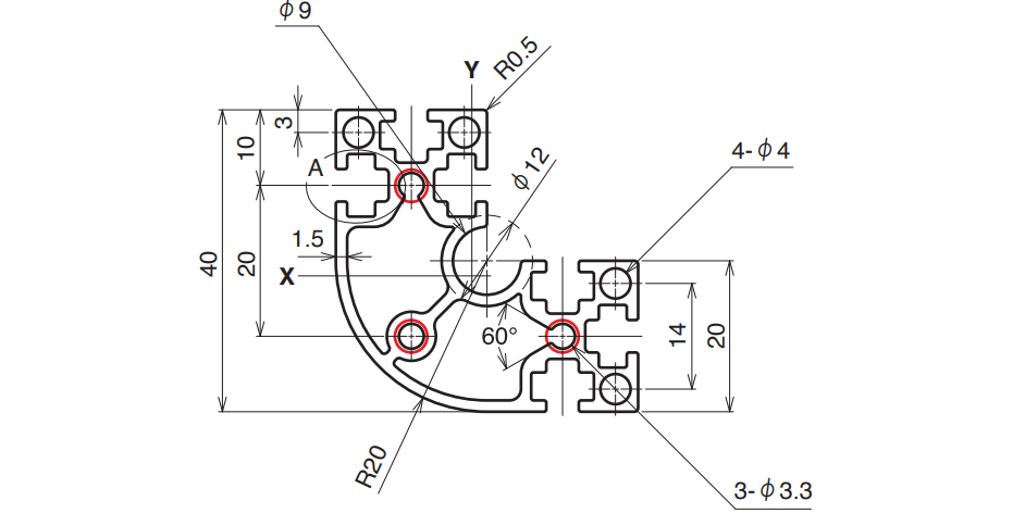 | 6,000 mm | 15–4,000 mm | A6063S-T5 | 185 N/mm² | 374.9 mm² | 1.012 kg/m | Ix 5.25 × 10⁴ mm⁴ Iy 5.25 × 10⁴ mm⁴ |