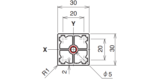 | 6,000 mm | 15–4,000 mm | A6063S-T5 (205) | 225 N/mm² | 333.8 mm² | 0.901 kg/m | Ix 3.30 × 10⁴ mm⁴ Iy 3.30 × 10⁴ mm⁴ |
