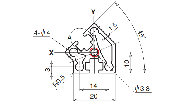 | 6,000 mm | 15–4,000 mm | A6063S-T5 | 185 N/mm² | 167.5 mm² | 0.452 kg/m | Ix 0.63 × 10⁴ mm⁴ Iy 0.66 × 10⁴ mm⁴ |
