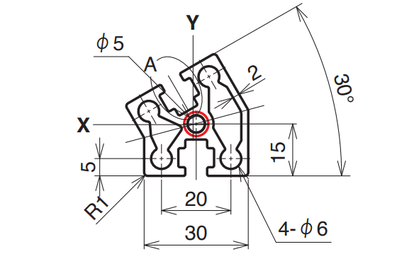 | 6,000 mm | 15–4,000 mm | A6063S-T5 (205) | 185 N/mm² | 400.6 mm² | 1.082 kg/m | Ix 3.53 × 10⁴ mm⁴ Iy 3.67 × 10⁴ mm⁴ |