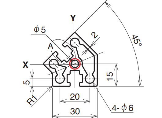 | 6,000 mm | 15–4,000 mm | A6063S-T5 (205) | 185 N/mm² | 405.5 mm² | 1.095 kg/m | Ix 3.55 × 10⁴ mm⁴ Iy 3.61 × 10⁴ mm⁴ |