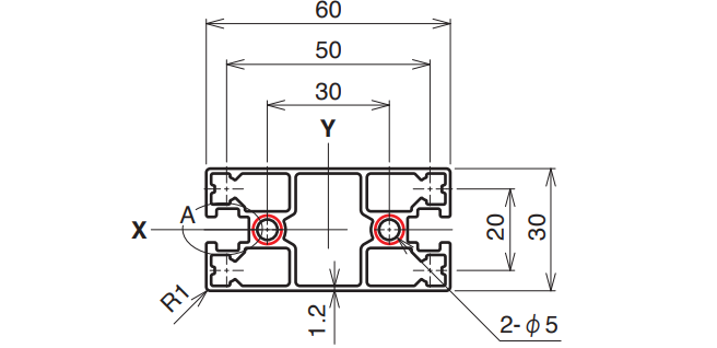 | 6,000 mm | 15–4,000 mm | A6063S-T5 (205) | 225 N/mm² | 478.0 mm² | 1.291 kg/m | Ix 4.54 × 10⁴ mm⁴ Iy 17.6 × 10⁴ mm⁴ |