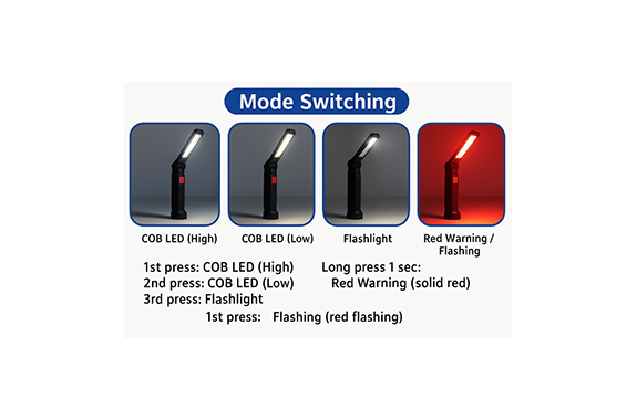 | Dimming function | COB LED (High / Low) Tip LED (High / Low) Warning light mode Red (on / flashing) |