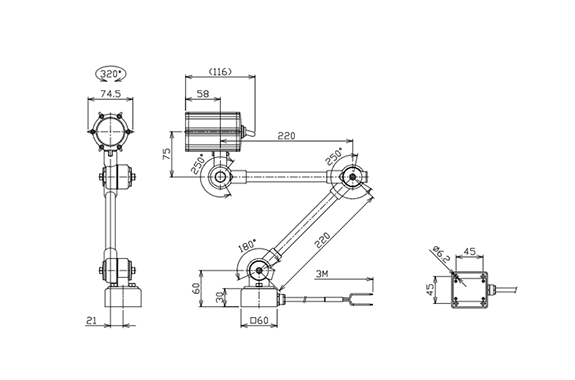 | Model | Arm length | Size | Arm Type | Power supply | Option |