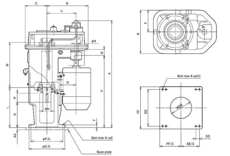 Series # | A | B | C | D | E | F | Input shaft | K | L | M | Ouput Shadtt | T | U | V | W | Size of mounting flange | Approx. weight (kg) | Approx. oil quantity (litters) | |||||