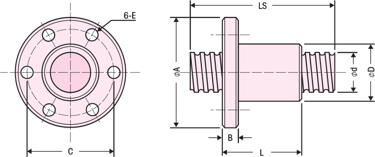 Nominal outer diameter of Screw | Lead | Root diameter of Screw | Allowable load W (N) | Allowable WN Value | Nut dimensions | Standard screw length LS | |||||