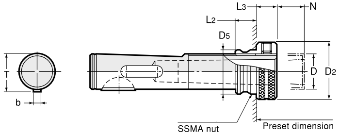 Model | Model | Adjustable adapter | D H6/h6 | D1 | L ±0.2 | G | D2 ±0.2 | D3 ±0.3 | D5 -0.04 -0.1 | L1 | L2 | L3 | b | T | N | kg |