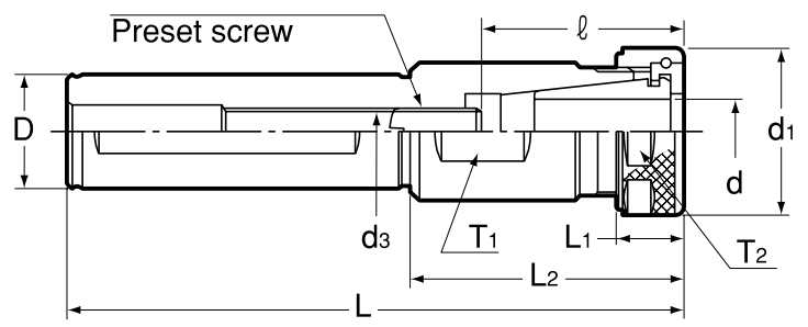 Model | Chuck Range | Type | D h6 | L | d1 | L1 | L2 | M | d3 | ℓ | T1 | T2 | Nut | kg |