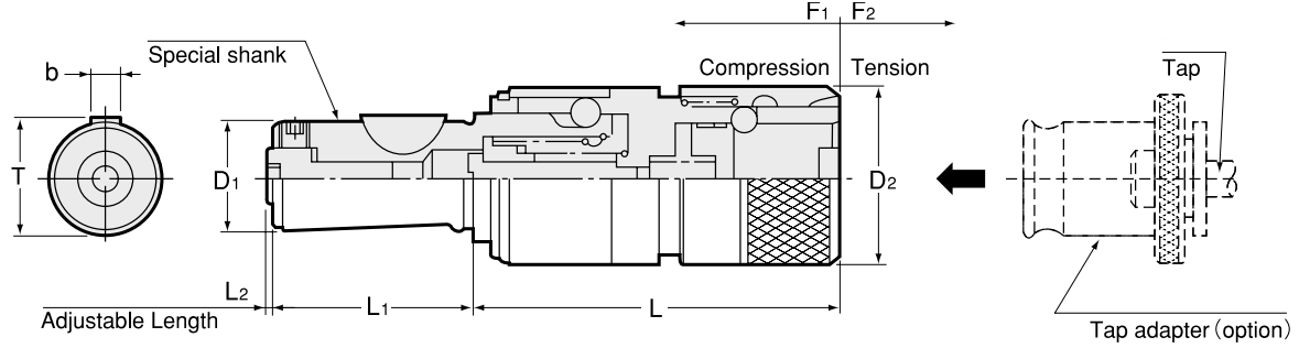 Model | Tap Size | Adapter Size | Axial Compensation F1 Compression | Axial Compensation F2 Tension | D1 h6 | D2 | L | L1 ±0.1 | T | b | L2 | kg |