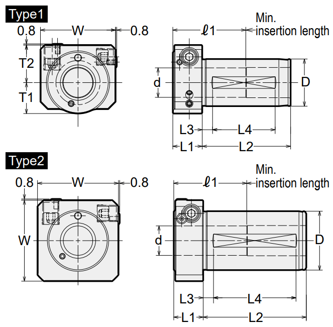 Model | Type | d | D | L1 | L2 | L3 | L4 | W | ℓ1 | T1 | T2 | Hex Wrench Size |