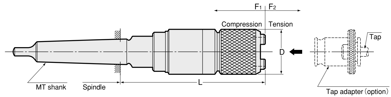 Model | Tap Size | Adapter Size | Axial Compensation | Compression (F1) | Tension (F2) | D | L | kg |