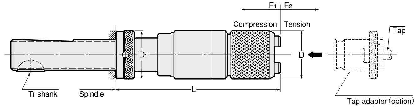 Model | Tap Size | Adapter Size | Axial Compensation | Compression (F1) | Tension (F2) | D | D1 | L | kg |
