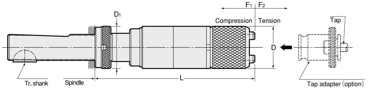 Model | Tap Size | Adapter Size | Radial Float | Compression (F1) | Tension (F2) | D | D1 | L | kg |