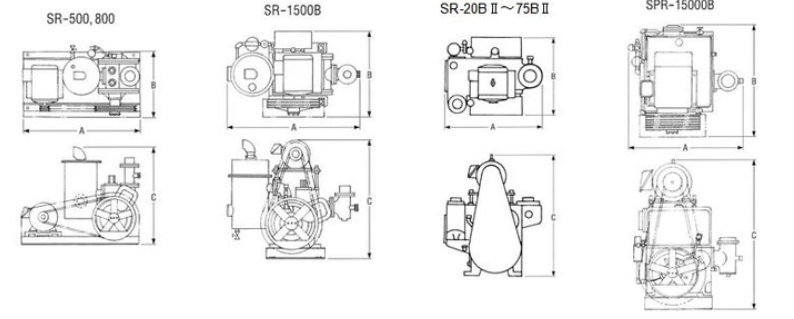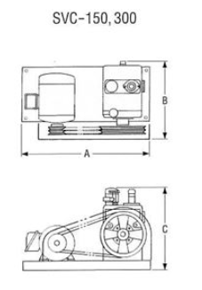 ModelPumping speed (L/min)Ultimate pressure (Pa)Rotational speed (min-1)Motor (4P) (kW)Oil volume (L)Inlet port diameterOutlet port diameterMinimum cooling water volume (L/min)Dimensions A×B×C (mm)Weight (kg)