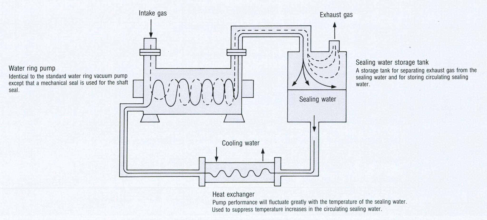 - These water-ring type pumps are suitable for exhaust gas that contains steam and water droplets.