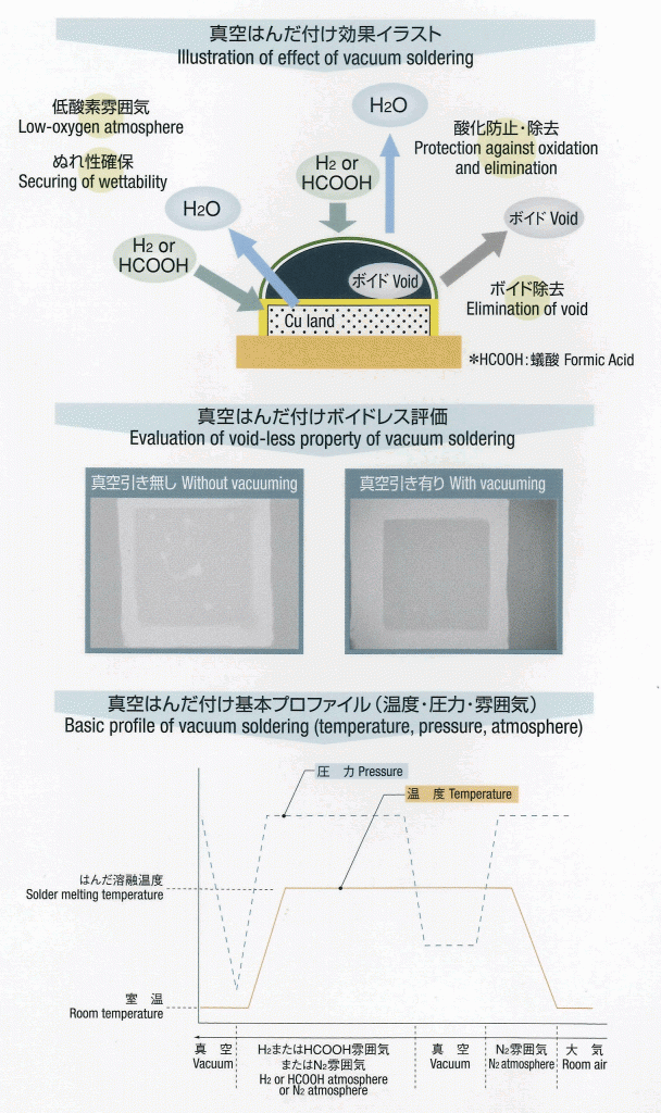 - Since solder is pre-heated in a reduction atmosphere, flux-free soldering is enabled.