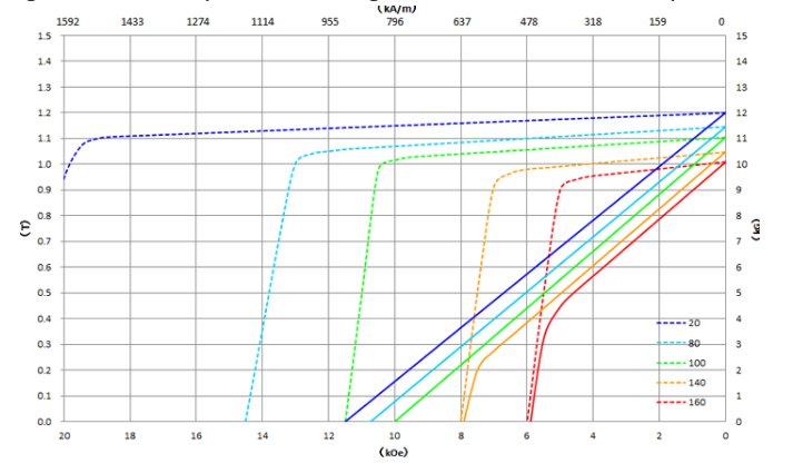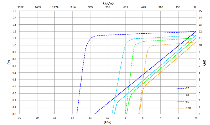 Neodymium magnet N35: Comparison of demagnetization curves due to temperature difference