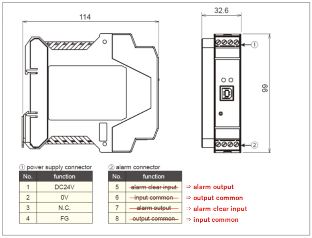 There is an error in the terminal arrangement of the external alarm connector in the dimensional drawing in the catalog.