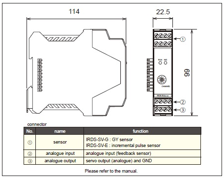 | Analogue input function | input signal | IRDS-SV11-G voltage (±10V) | IRDS-SV21-G current (±20mA) | IRDS-SV12-G voltage (±10V) | IRDS-SV22-G current (±20mA) | IRDS-SV11-E voltage (±10V) | IRDS-SV21-E current (±20mA) | IRDS-SV12-E voltage (±10V) | IRDS-SV22-E current (±20mA) |