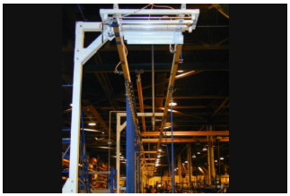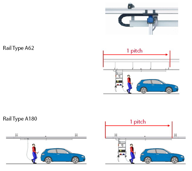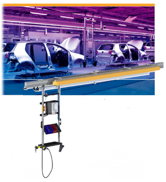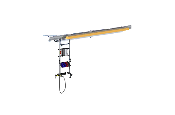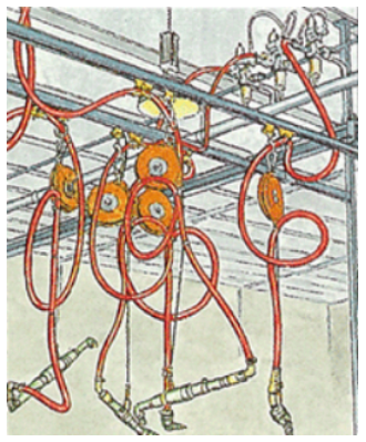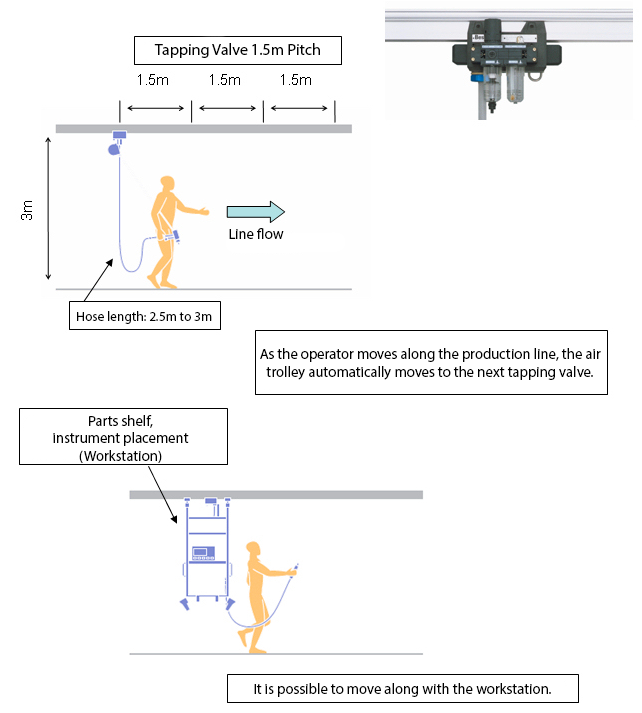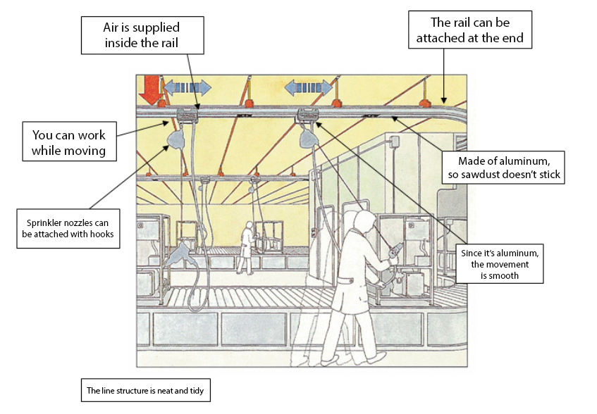 The key feature of this product is that the compressed air pipe itself serves as the traveling rail, and thanks to the development of the air trolley (a movable air outlet), it provides unrestricted movement and excellent operability.