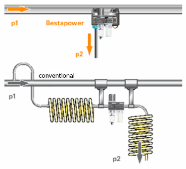 By using BESTA, pressure loss caused by the spiral hose is reduced, which helps to lower the required power of the compressor.