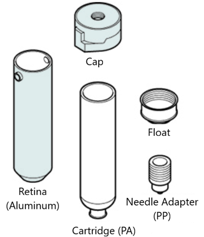 - The parts in contact with the fluid are made of resin and are of the cartridge type.