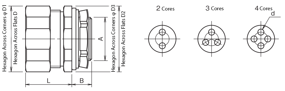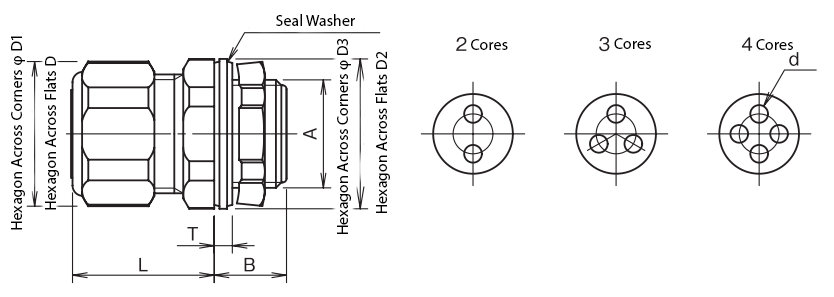 Outer Dia φd | Cores | Conduit Pipe Thread Nominal Size | Pipe Parallel Thread Nominal Size | Recommended Mounting Hole Diameter | |||||||||||