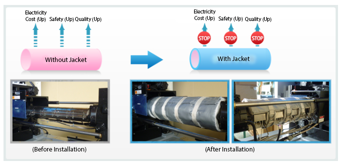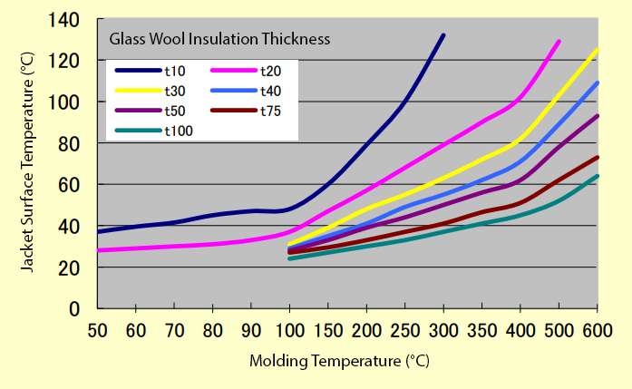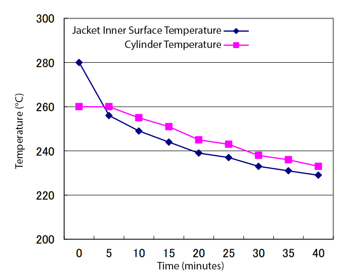 ★ Working Environment / Safety: After installation, the jacket surface temperature drops significantly below the molding temperature, contributing greatly to worker safety. (See graph below)