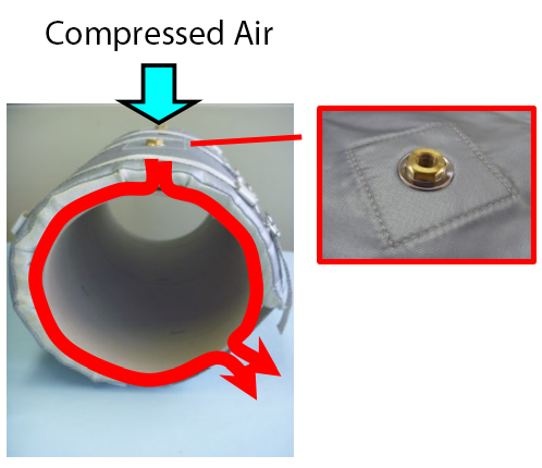 The compressed air injected from the Air Coupler fills the 30mm thick insulation material and is then exhausted as high-temperature air from the gap between the jacket and the cylinder while cooling the cylinder surface.