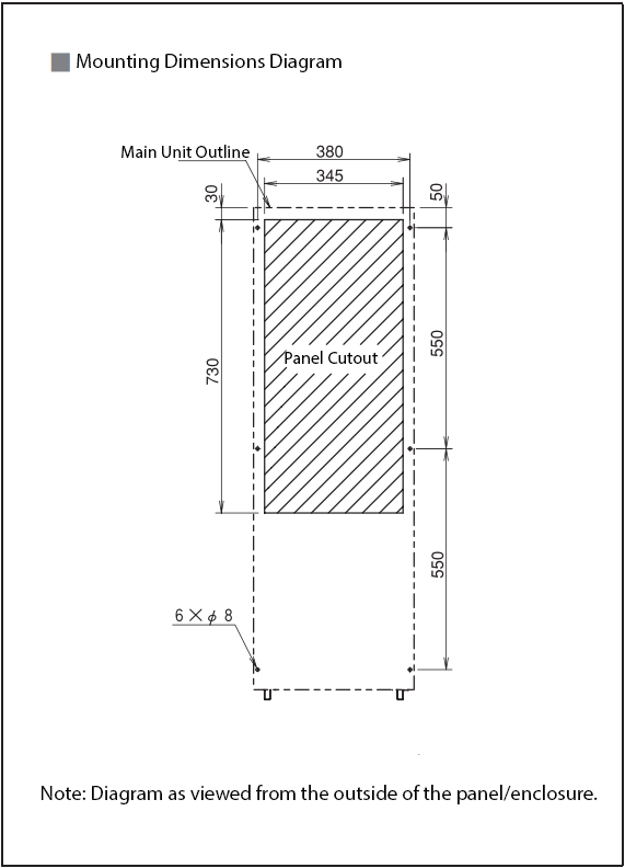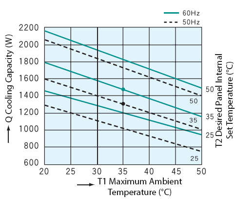 Note 1: Cooling capacity is the rated value at: Control Panel internal dry bulb temp 35°C, wet bulb temp 24°C, and Control Panel external dry bulb temp 35°C. Cooling capacity is based on Technical Document No. 007 of the Industrial Association of Thermal Equipment for Control Panels.