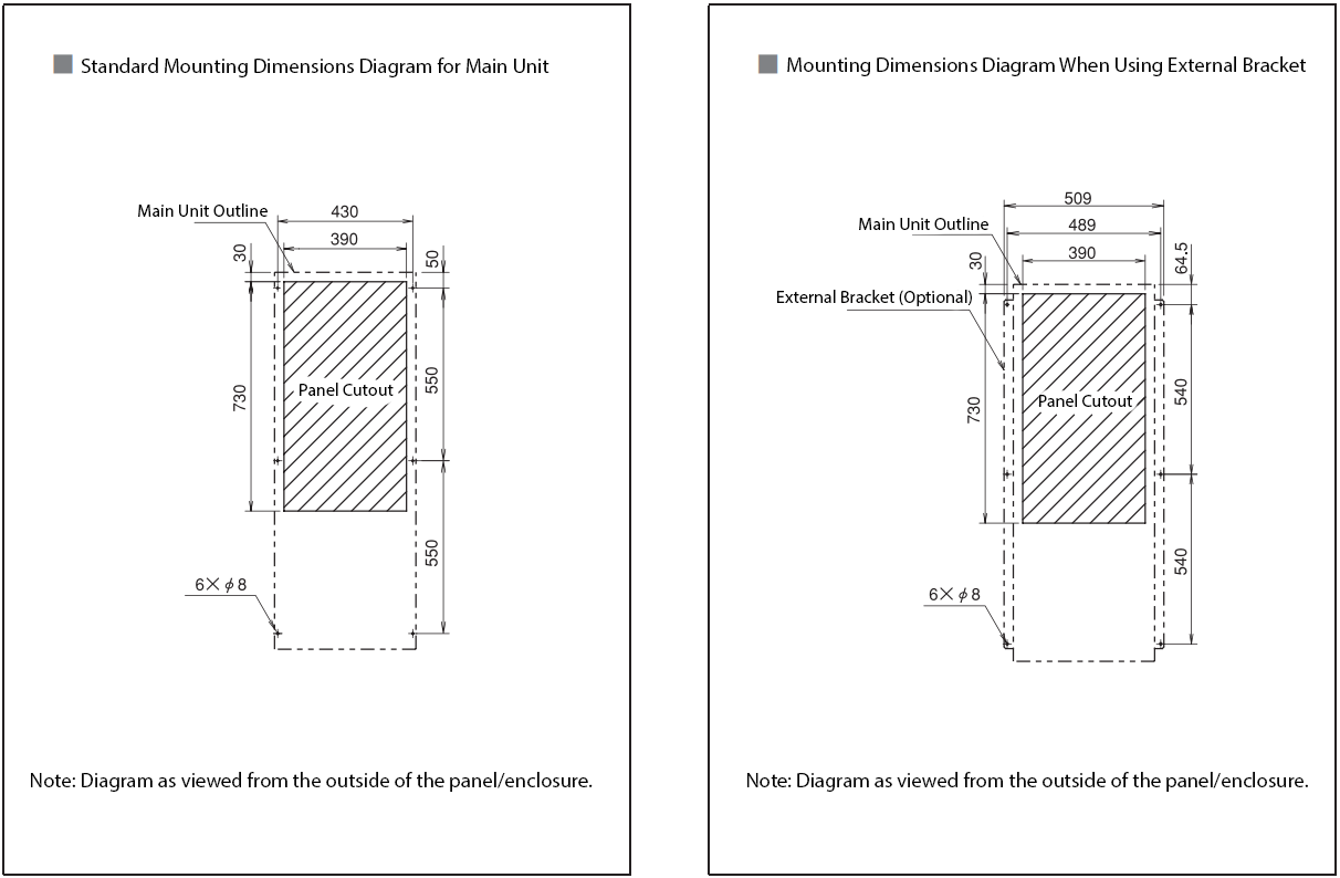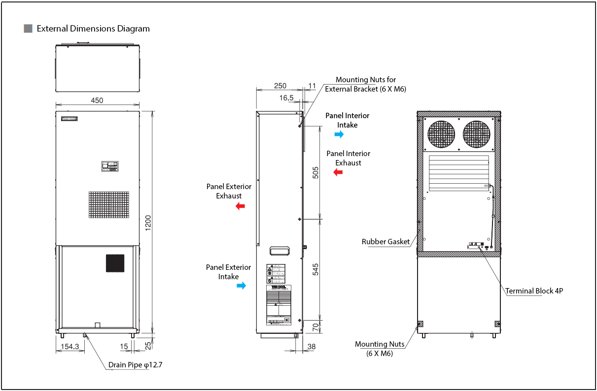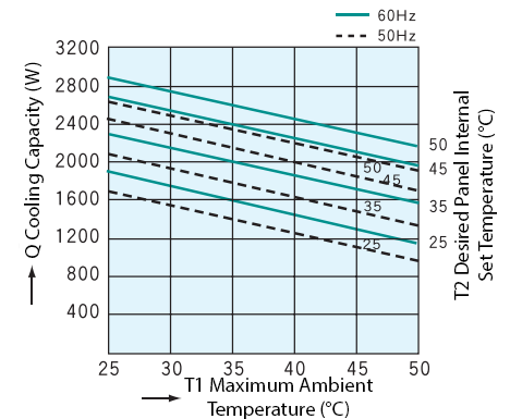 Note 1: Cooling capacity is the rated value at: Control Panel internal dry bulb temp 35°C, wet bulb temp 24°C, and Control Panel external dry bulb temp 35°C. Cooling capacity is based on Technical Document No. 007 of the Industrial Association of Thermal Equipment for Control Panels.