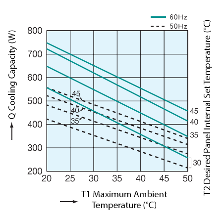 Note 1: Nominal value when ambient and panel internal temperatures are 35°C. Cooling capacity is based on Technical Document No. 007 of the Industrial Association of Thermal Equipment for Control Panels.