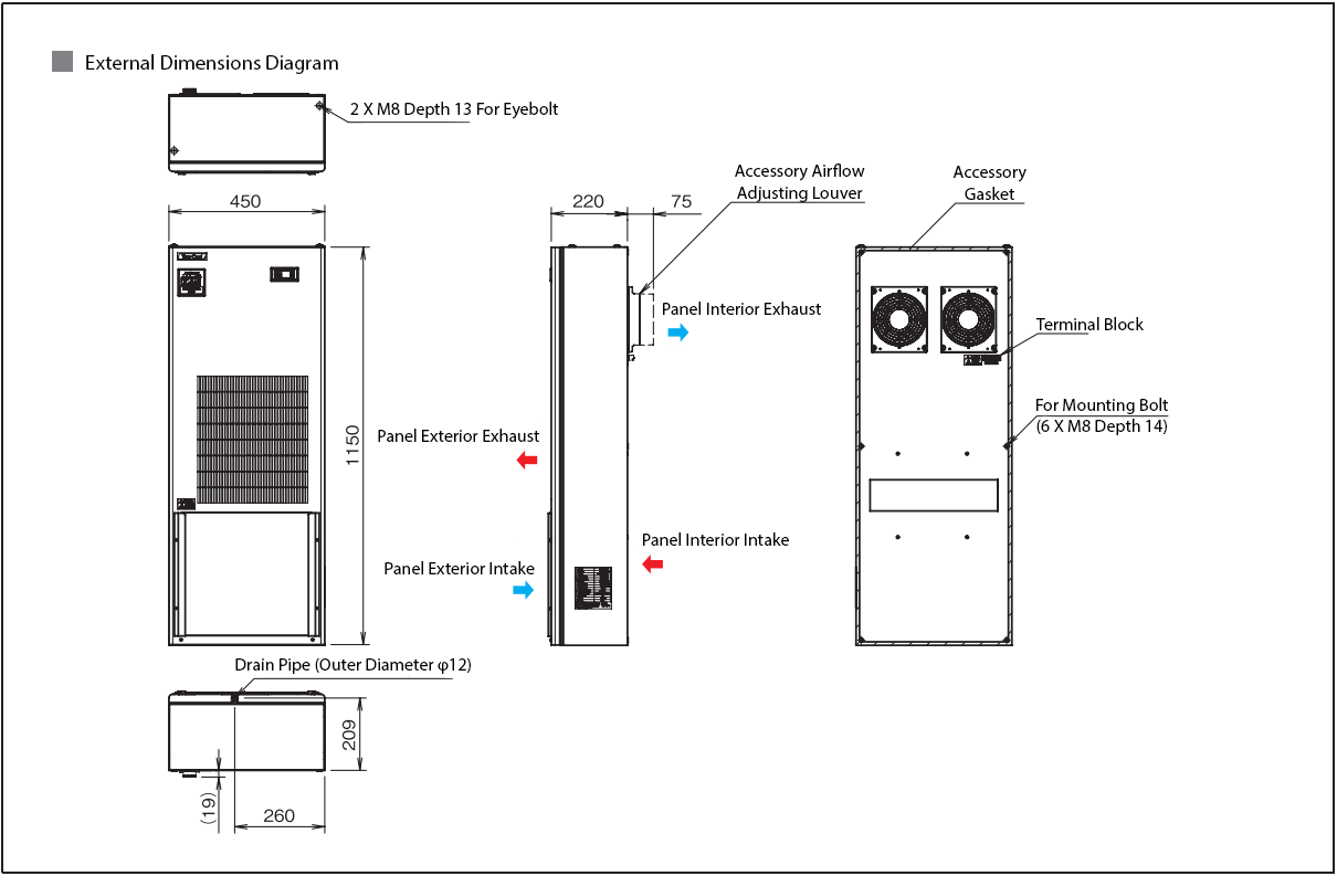 | Accessories | Terminal Block · 1 pc Mounting Bolts (M8 × 35L) · 6 pcs Drain Hose (2m) · 1 pc Gasket (t8 × 10W 3m) · 1 pc Airflow Adjusting Louver · 1 pc |