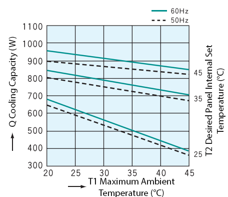 Note 1: Cooling capacity is the rated value at: Control Panel internal dry bulb temp 35°C, wet bulb temp 24°C, and Control Panel external dry bulb temp 35°C. Cooling capacity is based on Technical Document No. 007 of the Industrial Association of Thermal Equipment for Control Panels.