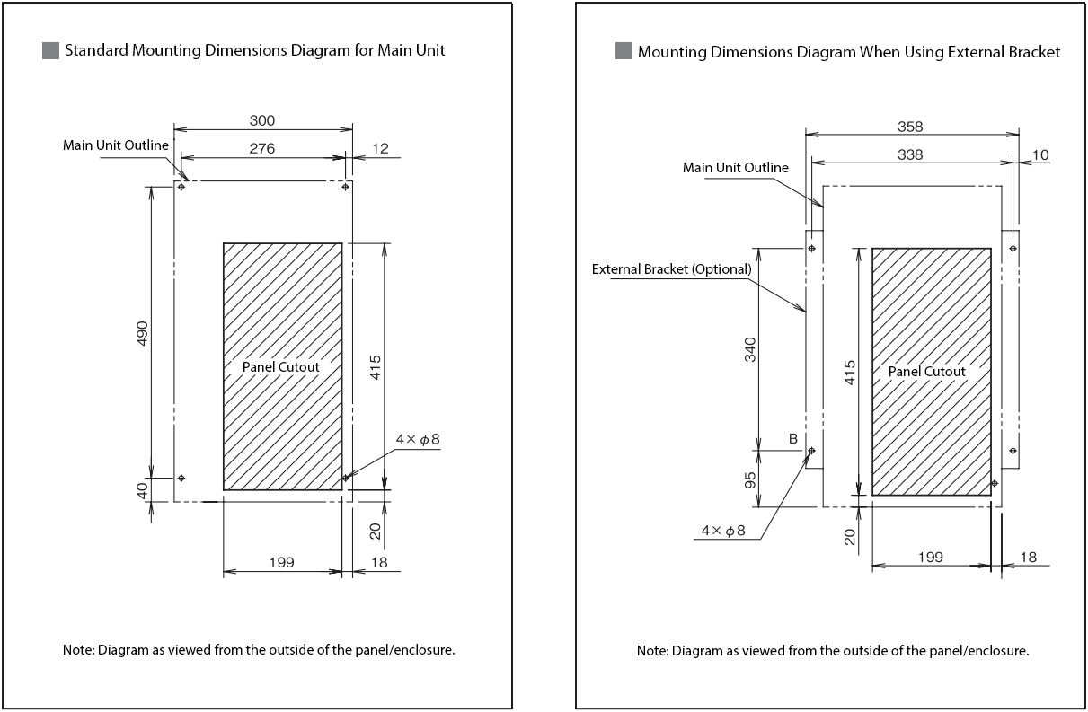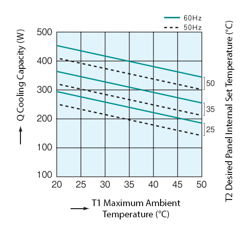 Note 1: Cooling capacity is the rated value at: Control Panel internal dry bulb temp 35°C, wet bulb temp 24°C, and Control Panel external dry bulb temp 35°C. Cooling capacity is based on Technical Document No. 007 of the Industrial Association of Thermal Equipment for Control Panels.