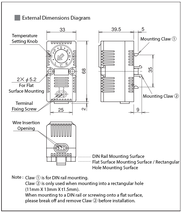 - Can be mounted on a DIN rail, flat surface, and rectangular hole (11mm X 13mm X t1.5mm).