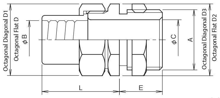 Model Name | Thick Wall Thread A | B | C | E | L | Across Flats D | Across Corners D1 | Across Flats D2 | Across Corners D3 | Mass (g) | Quantity per Bag (pcs) | ||