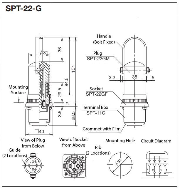 - The SPT-22-G-W, equipped with a fixing wire on the handle, is also available. (Wire length 280mm -> See P115)