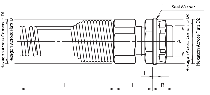 Accommodated Cable Outer Dia | Armor Screw A | B | T | Across Flats D | Across Corners D1 | Across Flats D2 | Across Corners D3 | Ring Length L | L1 | Mass (g) | |||||