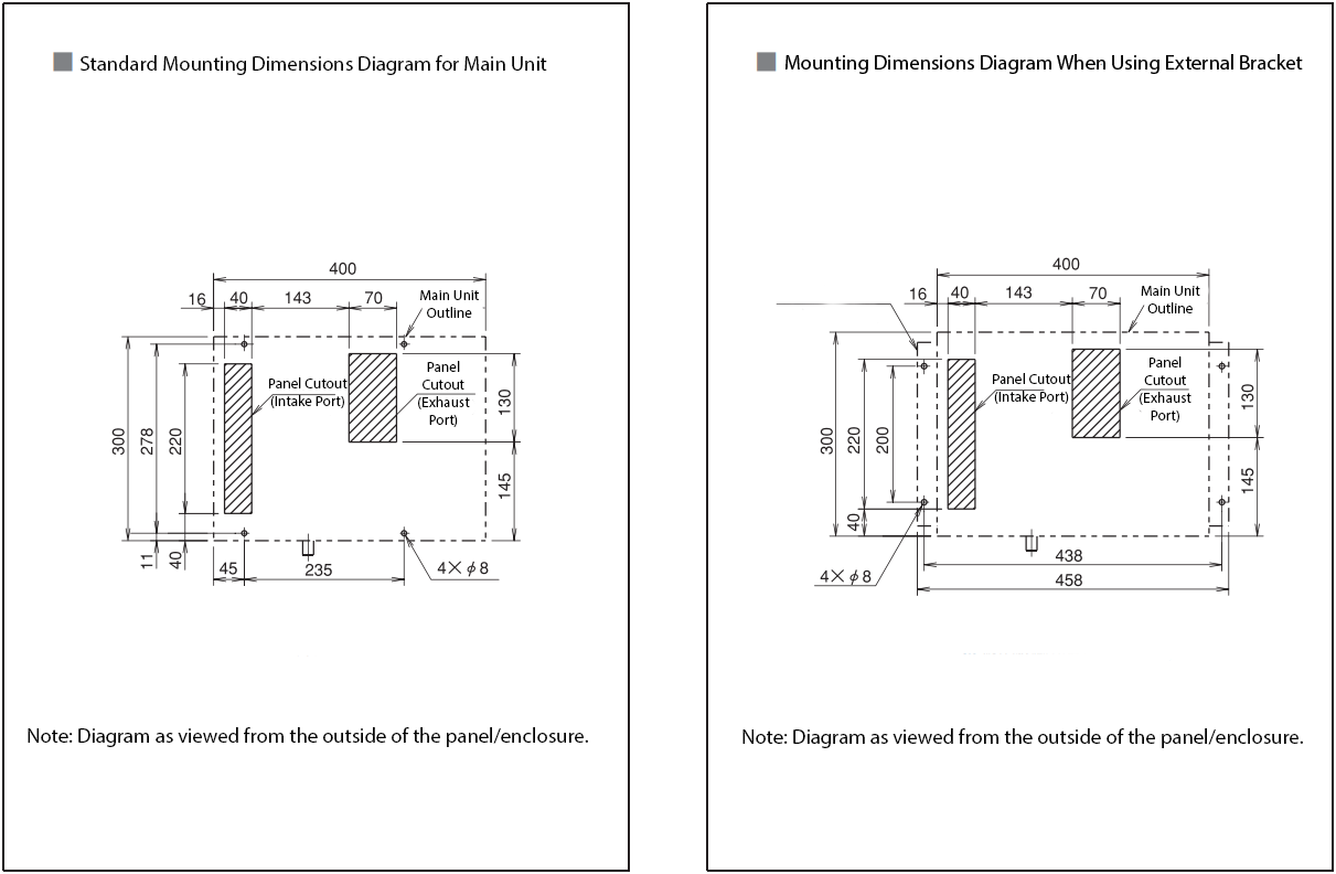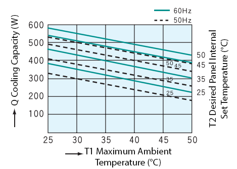 Note 1: Rated value at: Control Panel internal dry bulb temp 35°C, wet bulb temp 19.5°C, and Control Panel external dry bulb temp 35°C. Cooling capacity is based on Technical Document No. 007 of the Industrial Association of Thermal Equipment for Control Panels.