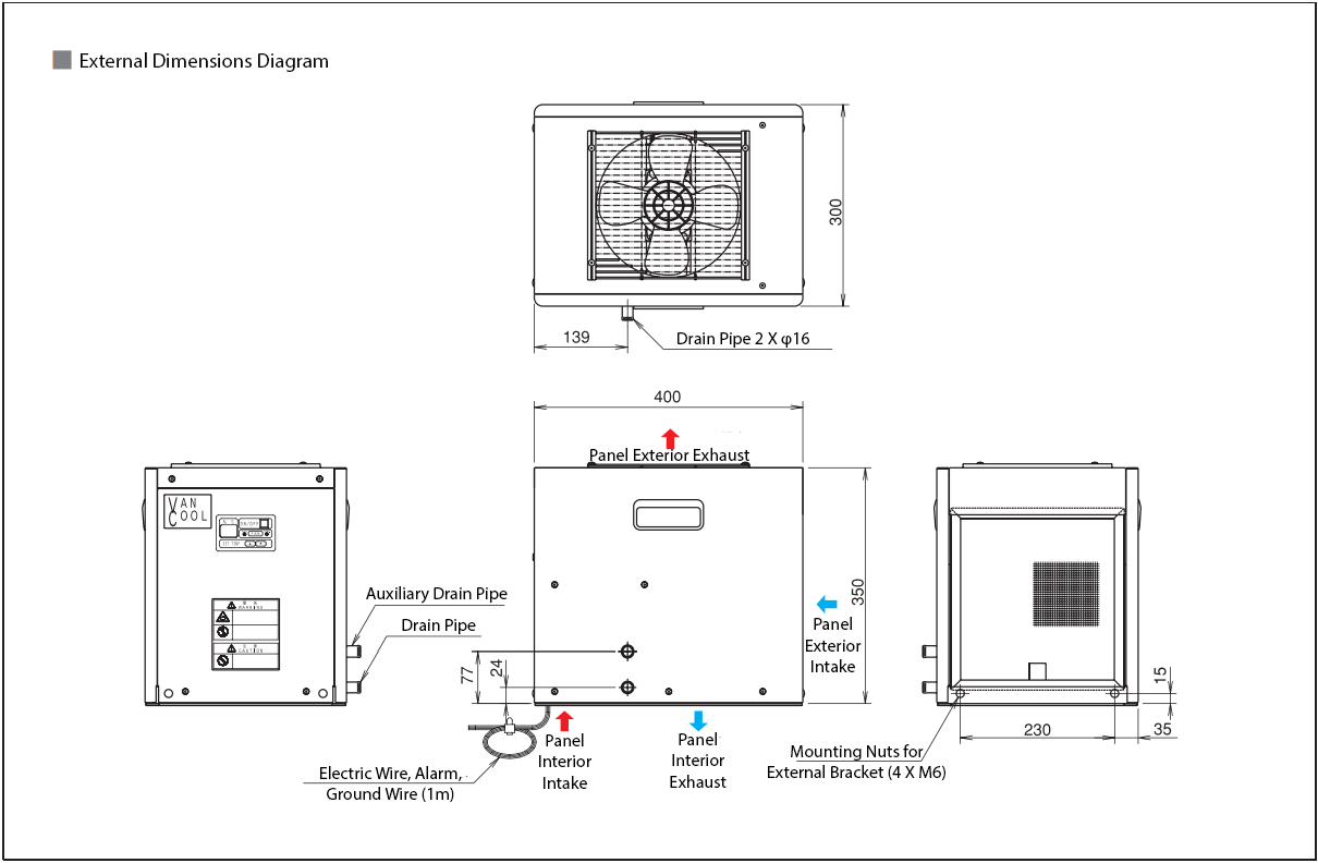 | Accessories | Mounting Bolts (M6 × 12L) · 4 pcs Drain Hose (3m) · 2 pcs Hose Clamp · 2 pcs L-shaped coupling · 4 pcs | |
