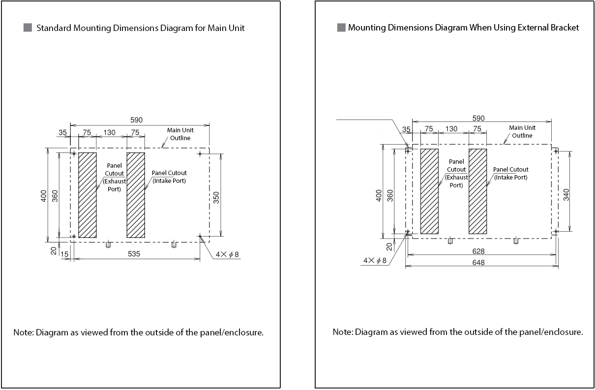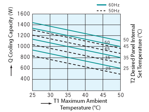 Note 1: Rated value at: Control Panel internal dry bulb temp 35°C, wet bulb temp 19.5°C, and Control Panel external dry bulb temp 35°C. Cooling capacity is based on Technical Document No. 007 of the Industrial Association of Thermal Equipment for Control Panels.