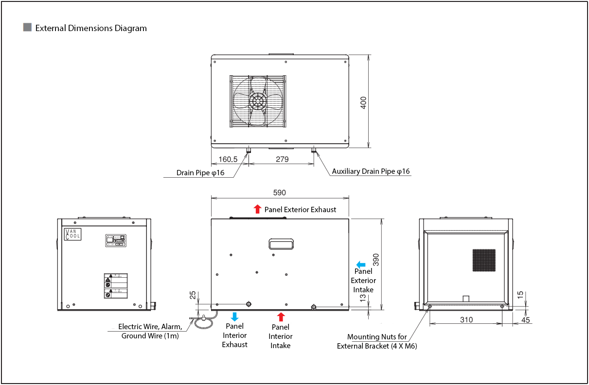 | Accessories | Mounting Bolts (M6 × 12L) · 4 pcs Drain Hose (3m) · 2 pcs Hose Clamp · 2 pcs L-shaped coupling · 4 pcs | |