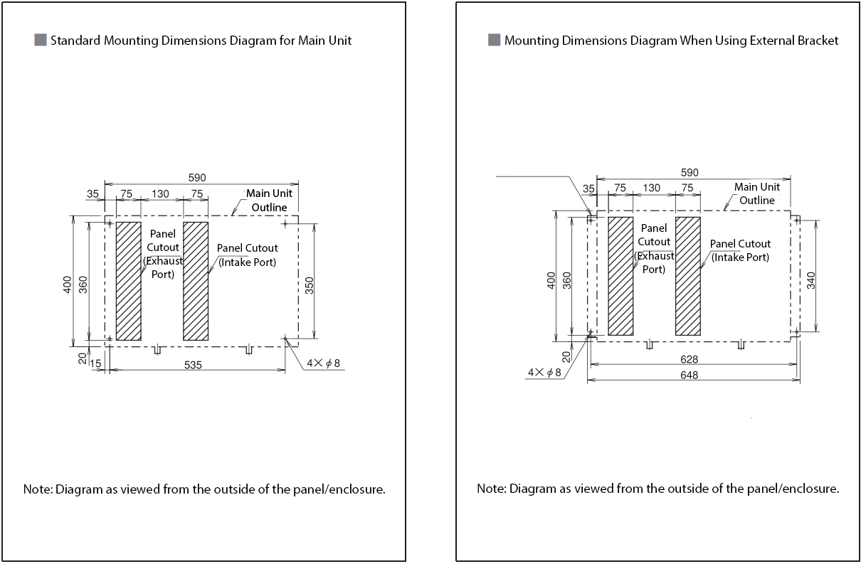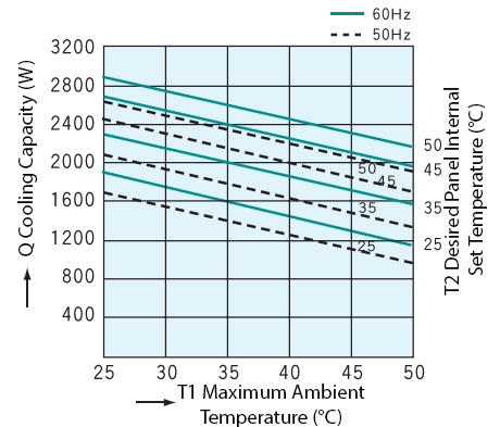 Note 1: Rated value at: Control Panel internal dry bulb temp 35°C, wet bulb temp 19.5°C, and Control Panel external dry bulb temp 35°C. Cooling capacity is based on Technical Document No. 007 of the Industrial Association of Thermal Equipment for Control Panels.