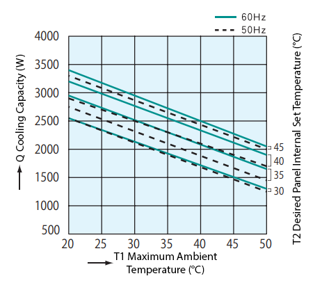 Note 1: Nominal value when ambient and panel internal temperatures are 35°C. Cooling capacity is based on Technical Document No. 007 of the Industrial Association of Thermal Equipment for Control Panels.